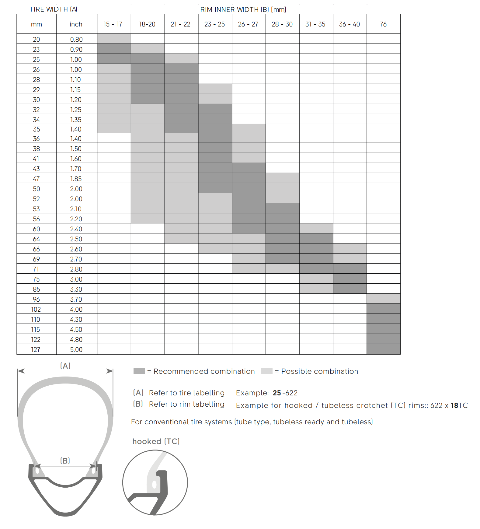 The diameter of your tyre’s bead must match the rim you’re putting it on. Rim and tyre diameters can be measured in a range of different standards, originating from different parts of the world. For example, 700c, 622, 28″ and 29″ tyres all mount to the same diameter rim, with ISO 622mm.