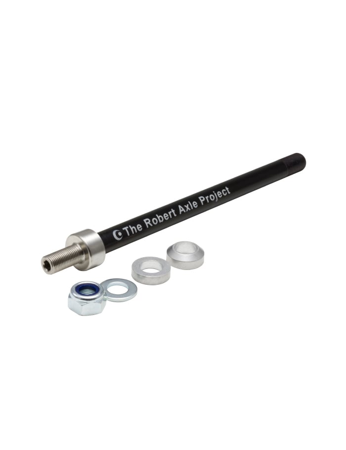 SPECIFICATION Robert Axle for Hitch-Mount Trailers replaces your stock axle to attach your child trailer to your 12mm thru-axle equipped bike. This axle is compatible with Burley, Carry Freedom, Chariot/Thule, Croozer, Instep, and many more. The true length of the axle shaft is 167mm, but can be shorted using the included spacers – a flat spacer and a tapered X-12 spacer. This allows for axle lengths of 152 mm or 167 mm. Please note: Thru-axle lengths do not equal hub standards. An axle has to be longer than the hub to fit in the frame. (A 12×142 hub does not equal a 142mm long axle) This axle has a 1.0 mm thread pitch. The axle shaft and axle end are precision CNC machined. The axle shaft is 7075 aluminum and hard black anodized for rugged durability. The axle end is stainless steel, which allow for mounting of the hitch provided with your trailer. The threads are M10x1 (metric). Hardware for attachment of the hitch is included; the hitch is not. No special tools required. Design allows for installation or wheel removal using your standard 5mm hex wrench. Designed, built and quality tested in the USA . Proven around the world.