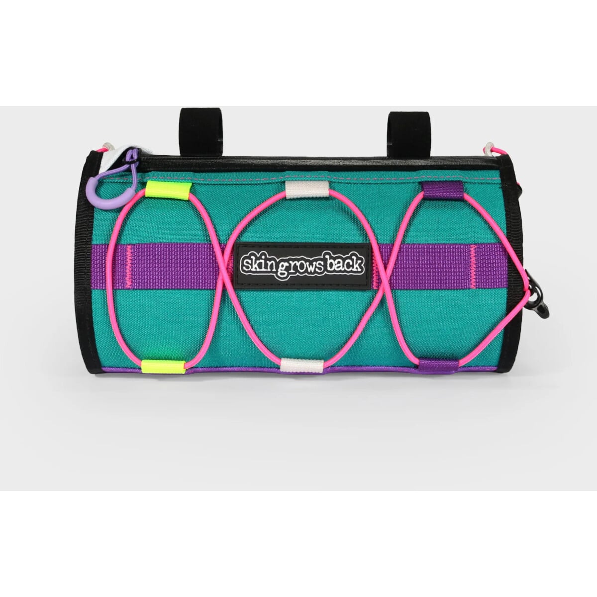 The webbing across the front panel allows the rider to mount a light on the front of the bag. The shock cord assembly is handy for a pump or similar items, use your imagination on this one.