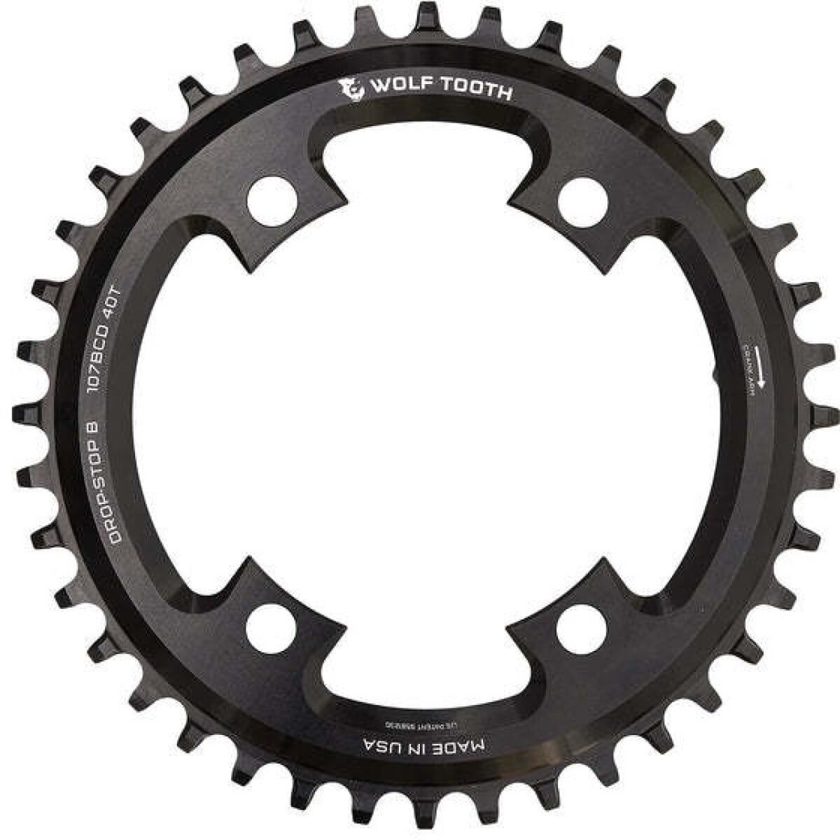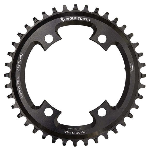– Drop-Stop technology prevents dropped chains. On Wolf Tooth’s patented wide/narrow chainring, the wide side of the tooth has maximum contact on the drive side which spreads the load and improves chainring life. The narrow side allows clearance for mud and debris while reducing friction.