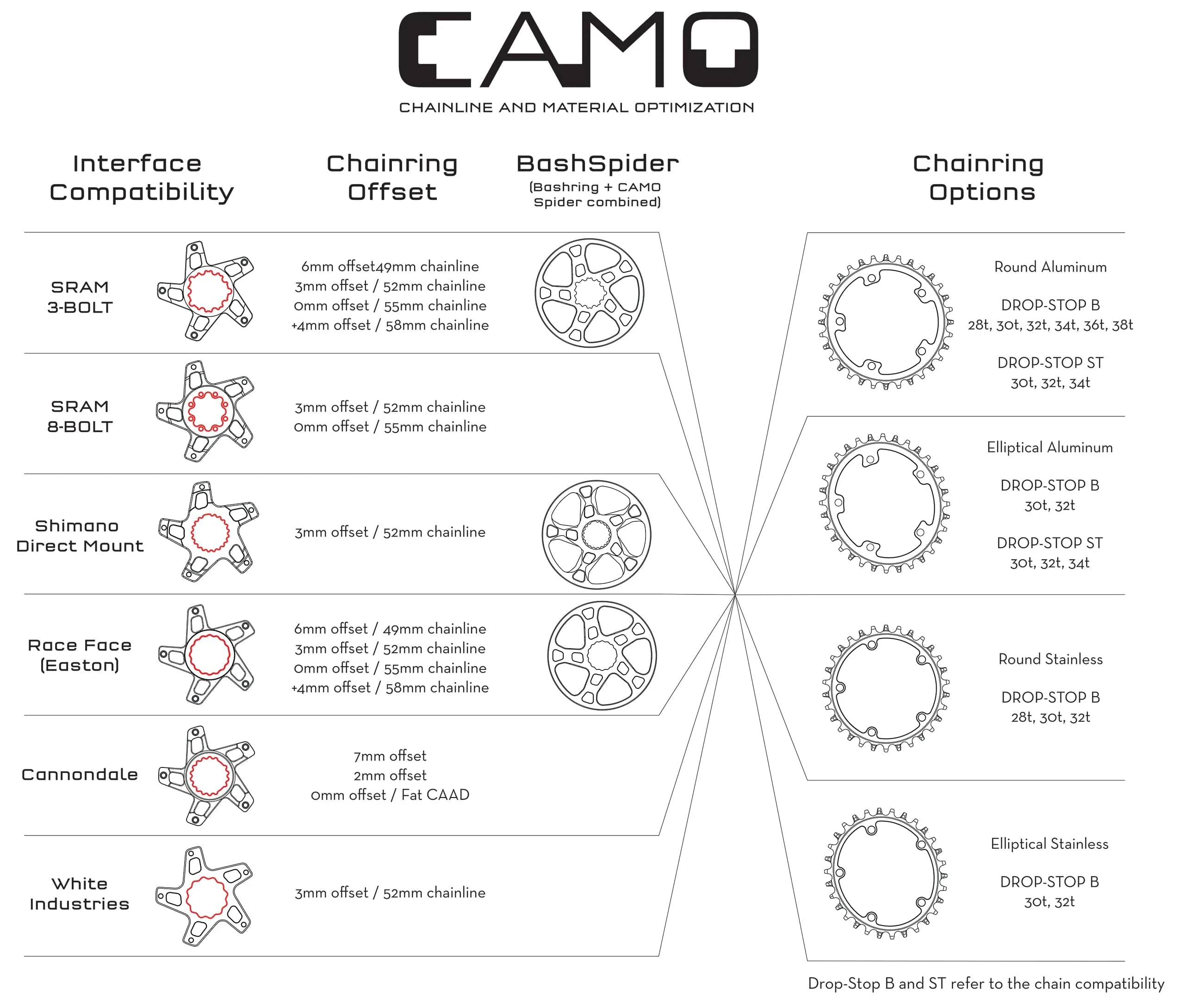 We created CAMO (Chainline And Material Optimization) for direct mount style cranksets. Easily swap between chainrings on a whim and enjoy a variable selection of chainring options, all compatible with your selected CAMO spider or BashSpider. With no nuts or spacers involved, swapping chainrings takes less time than brewing a cup of your favorite beverage. CAMO is compatible with a variety of brands, including Race Face Cinch, Shimano, SRAM, White Industries, and more.